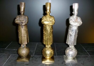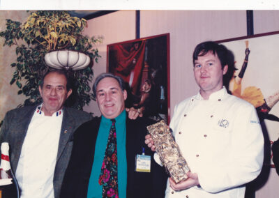 Guy Bardel et Eve LOPEZ tenant le prestigieux trophée du Bocuse d’Or avec le gagnant François Adamski le Chef