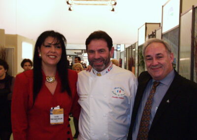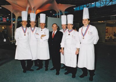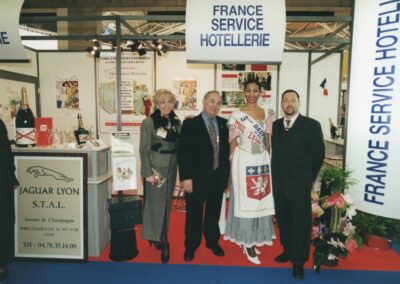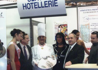 Remise d’un plateau en argent massif à Mr Paul, prix de l’excellence du deuxième millénaire en 2001 sur le stand France Service Hôtellerie au Sirha en présence des Miss et du MOF William JACQUIER