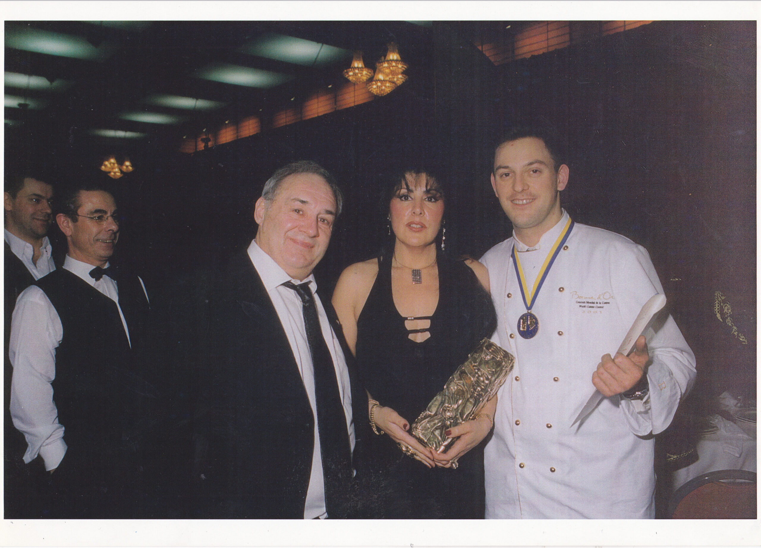 Guy Bardel et Eve LOPEZ tenant le prestigieux trophée du Bocuse d’Or avec le gagnant François Adamski le Chef